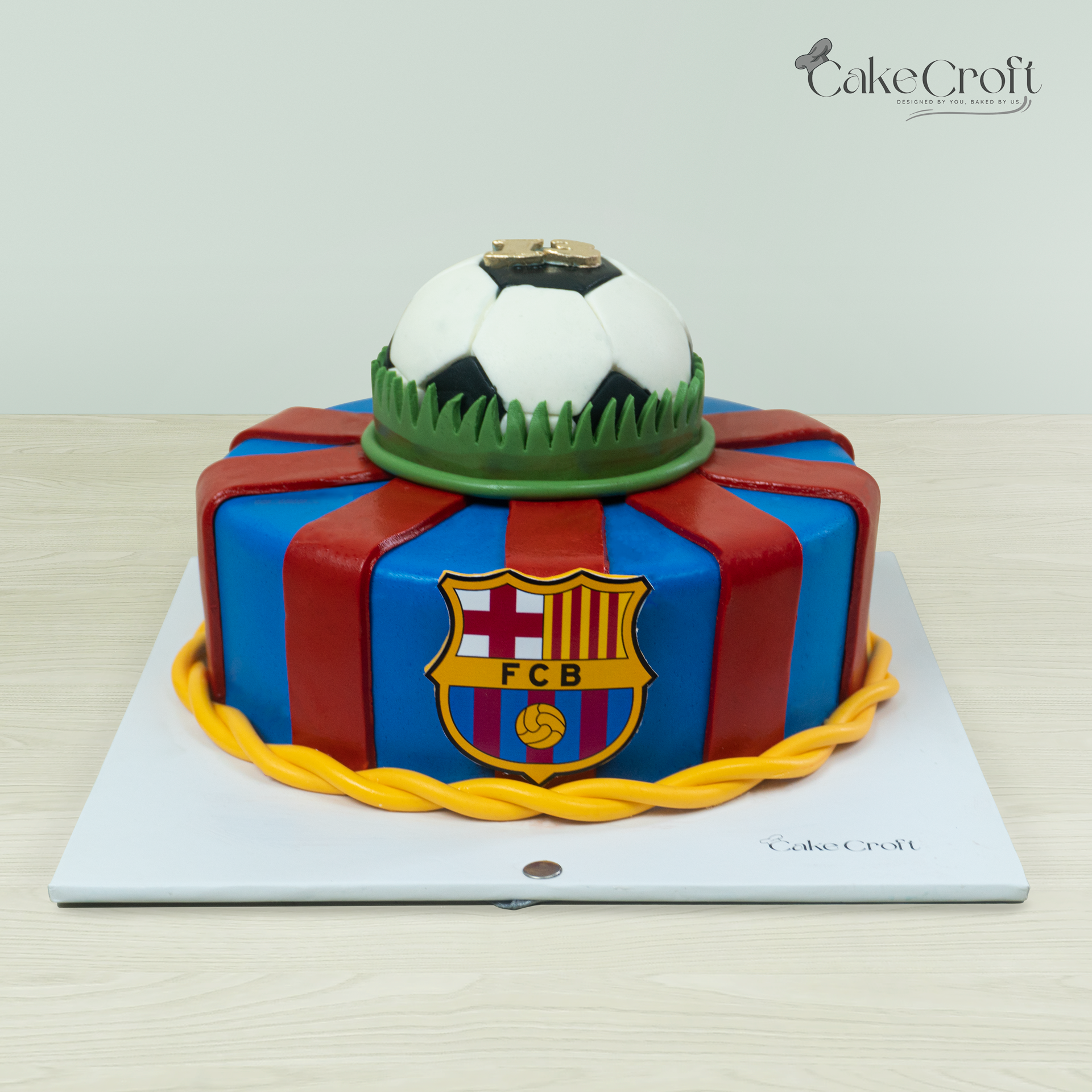 This FC Barcelona football theme cake is a perfect blend of simplicity and sports excitement. Featuring smooth fondant stripes in classic Barça colors and a football dome topper, it’s ideal for fans who love a clean yet striking design.