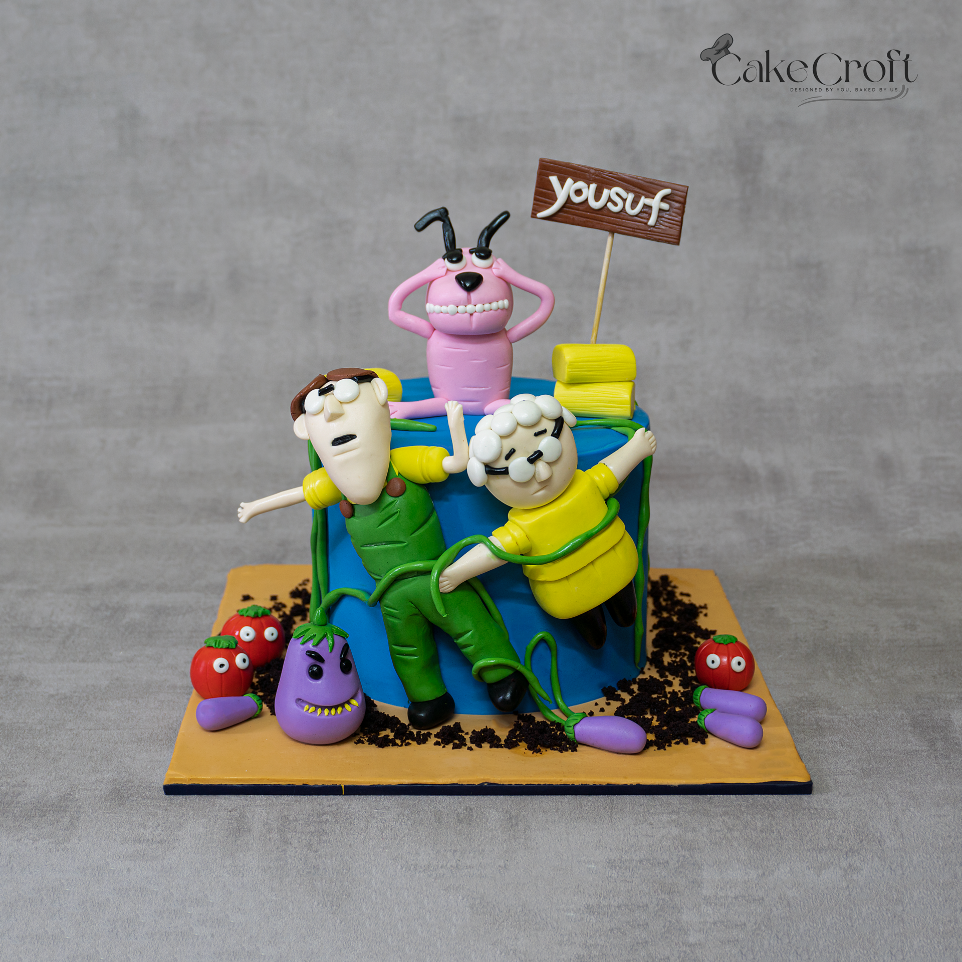 Step into nostalgia with CakeCroft’s Courage the Cowardly Dog Cake — a fun and spooky creation inspired by the iconic cartoon! Decorated with handcrafted fondant figures of Courage, Muriel, and Eustace, along with quirky vegetables and garden details, this cake perfectly captures the show’s playful and eerie vibe.