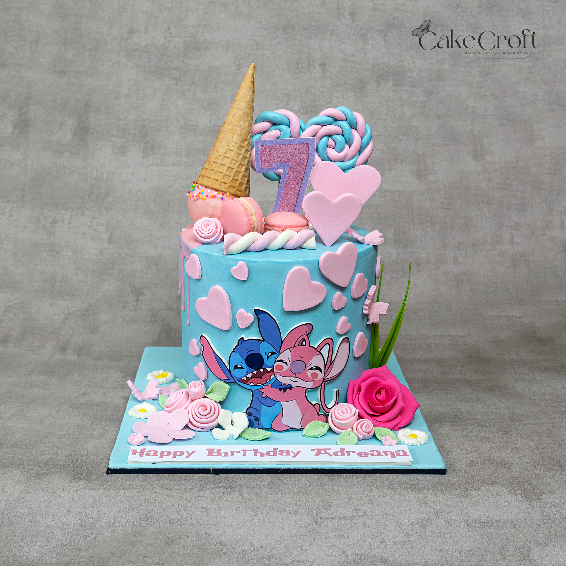Spread love and joy with CakeCroft’s Stitch & Angel Birthday Cake — the perfect blend of cuteness and color! Decorated in pastel blue and pink, it features adorable Stitch and Angel characters surrounded by candy hearts, lollipops, ice cream cones, and flowers.